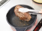 - 肉の表面に塩、胡椒をふりよくなじませます。フライパンにオリーブ油を熱し、肉の全面を各1分ずつ焼きます(中火)。